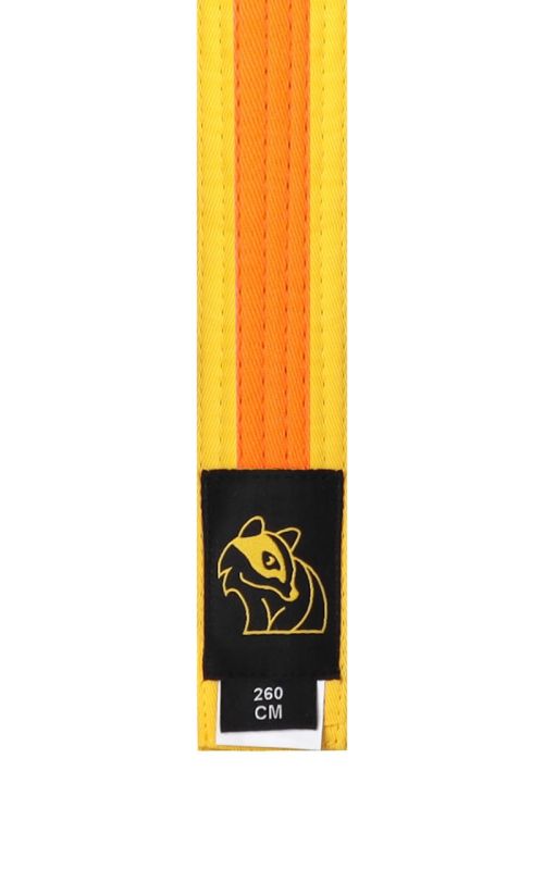 Oranssi raita ommeltuna muuten keltaiseen vyöhön.